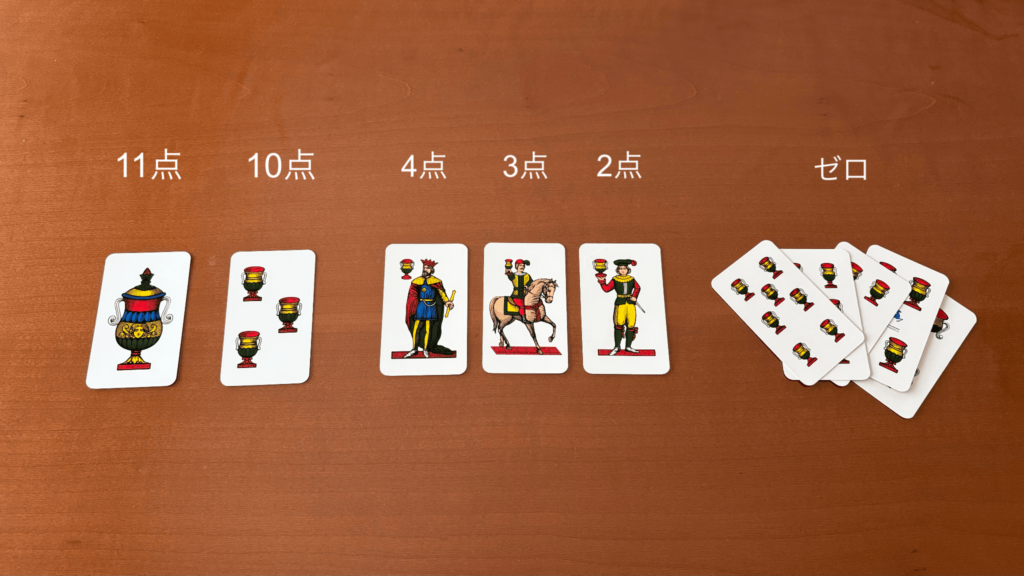 杯の7、8(歩兵)、9(騎士)、10(王様)、又は3(1枚10点)か1(1枚11点)だった場合は、