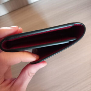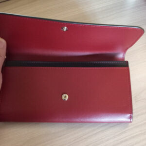 (研修で作ったサンプル。赤い革財布の、黒くムラなく塗られたツヤのある縁。下地が透けてはいけない)